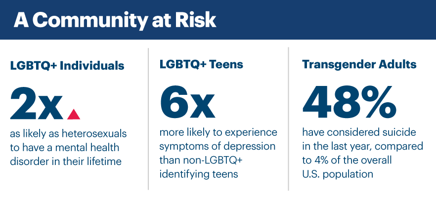 Experiences like these are common among lesbian, gay, bisexual, transgender, queer and other sexual and gender minority individuals (LGBTQ+) and can negatively impact their health and well-being. As a result, LGBTQ+ individuals experience greater risks of mental health issues, substance abuse and chronic conditions that lead to care delays, emergency room visits and poorer health overall.
