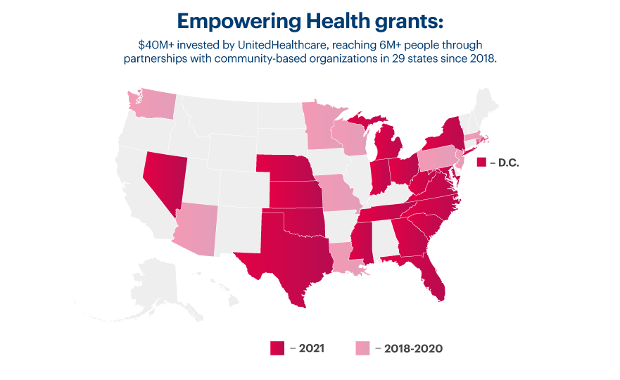 With this in mind, UnitedHealthcare is awarding $11.4 million in Empowering Health grants across 18 states and the District of Columbia to help address these needs for uninsured individuals and underserved communities. Since launching its commitment in 2018, UnitedHealthcare has invested more than $40 million in Empowering Health grants, reaching more than 6 million people through partnerships with community-based organizations in 29 states.
